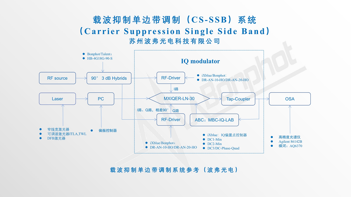 目前苏州888官网集团光电科技有限公司提供的基于法国iXblue公司的高消光比IQ调制器(MXIQER)、配合我们提供的驱动(DR-AN-10-HO/DR-AN-20-HO)以及偏置控制器(MBC-IQ-LAB-A1),可以实现>30dB(1000:1)载波抑制比,具有无可比拟的性能及优势。