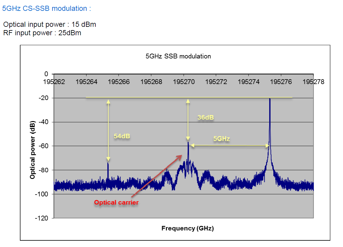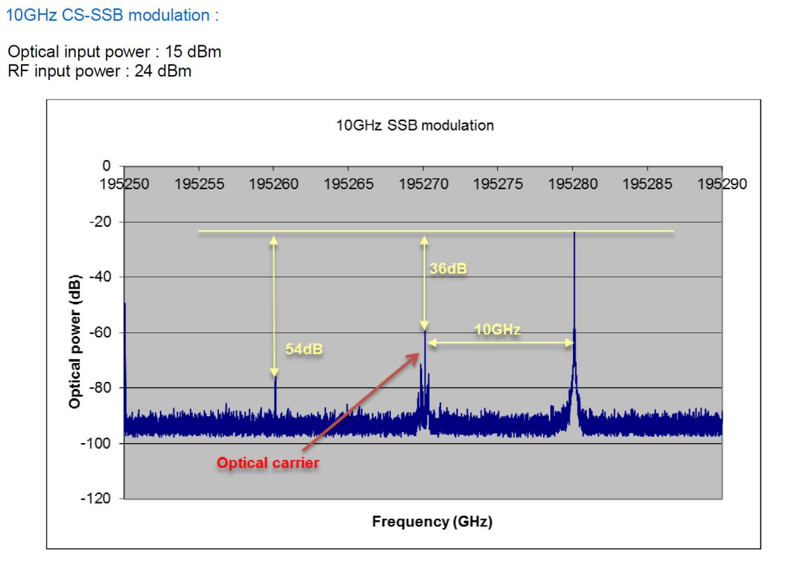 苏州888官网集团光电科技有限公司提供完整的载波抑制单边带调制(Carrier Suppression Single Side Band)方案。基于法国iXblue高消光比、高抑制比、高载波衰减的高性能铌酸锂IQ调制器(MXIQER-LN-30),提供高达32dB载波衰减、边带衰减,是目前市面上针对于单边带调制应用性能最好的调制器之一。