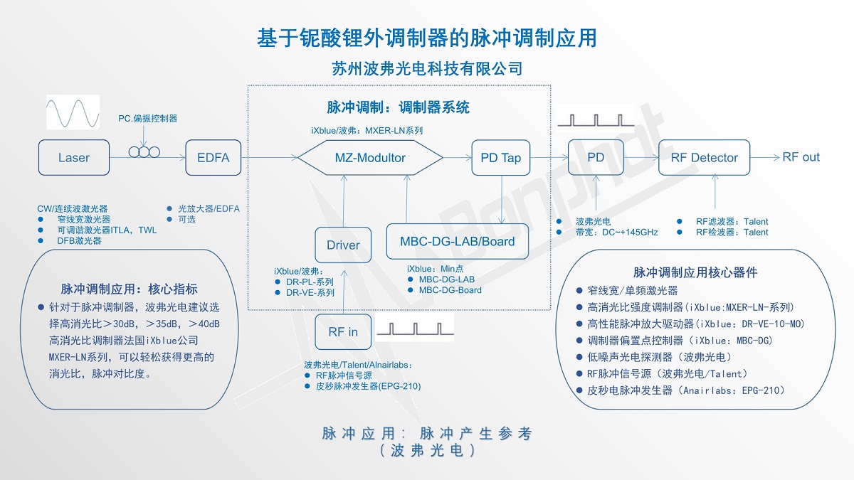 苏州888官网集团光电科技有限公司提供基于法国iXblue公司铌酸锂马赫增德尔高消光比强度调制器的脉冲调制元件的脉冲调制方案,这些方案包括常用的脉冲产生(脉冲调制)、脉冲整形、脉冲拾取等。基于法国iXblue高消光比强度调制器MXER-LN系列,可以轻松获得足够的消光比和脉冲对比度。更多详细情况请联系苏州888官网集团光电科技有限公司相关销售人员获取。