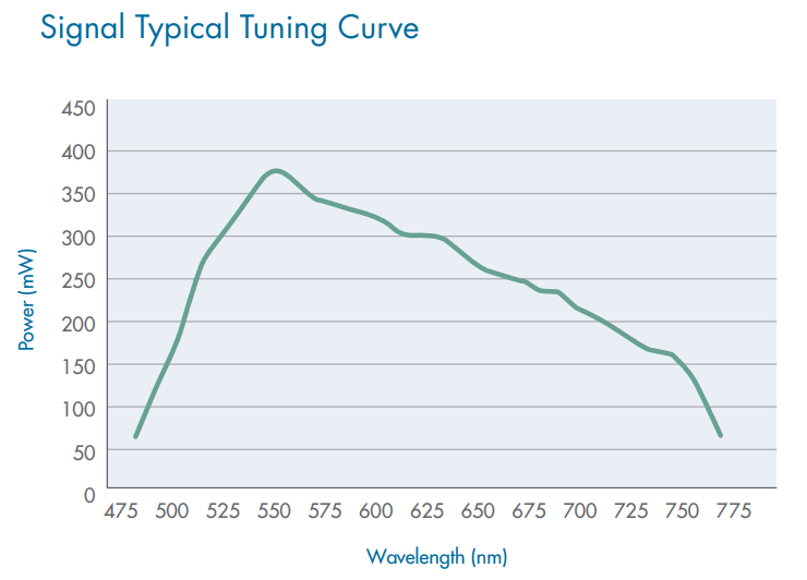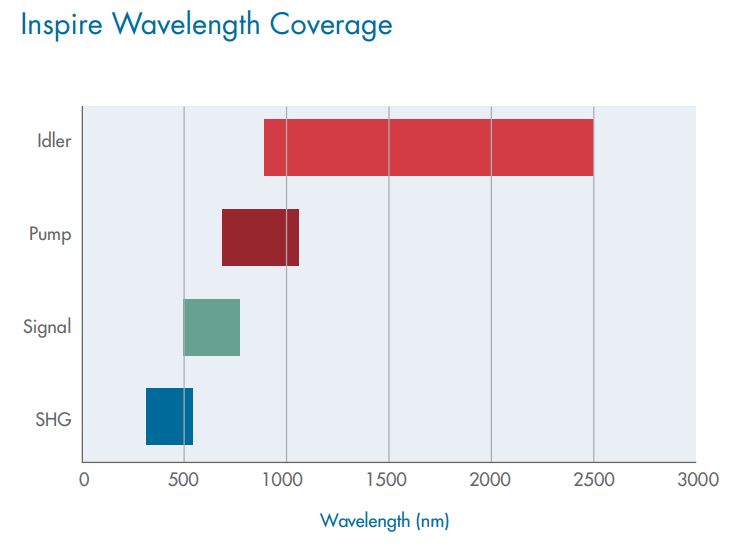 基于RadiantisTM专利技术,InspireTM可在345–2500 nm的光谱范围内无间隙地提供具有高平均功率的接近变换限制的脉冲。凭借一套光学器件和一个标准配置,Inspire™的独特设计提供了对整个系列的一流访问,无需更改配置并确保同时访问可见光和红外光。四个独立的输出端口提供一流的光谱覆盖范围,包括双泵浦(345–520 nm)、信号(490–750 nm)、惰轮(930–2500 nm)和耗尽泵浦(640–1040 nm)。
