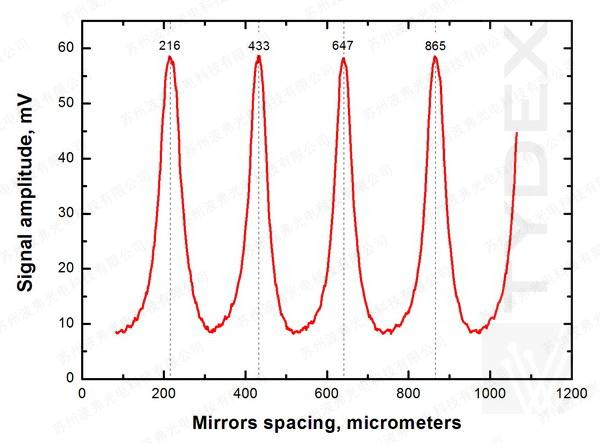 图 3. 光声探测器 Tydex GP-1P 与 TSFPI 反射镜间距的信号幅度。 太赫兹辐射由光学泵浦亚毫米波激光器产生,λlas = 432 μm