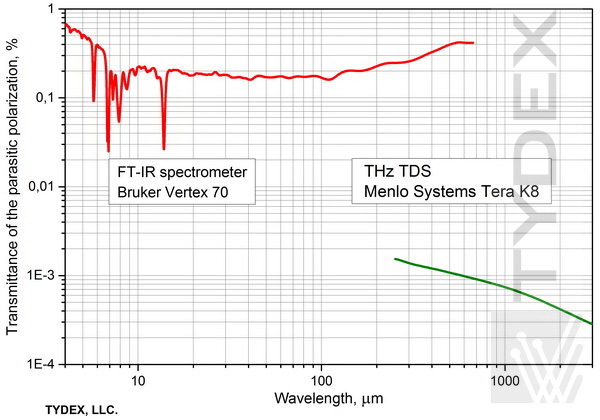 偏振器的透射光谱由两台仪器测量。 在 0.9 – 670 μm (333.1 – 0.45 THz) 的短波范围内,使用了 FT 光谱仪 Bruker VERTEX 70。 在 150 – 3000 μm (2 – 0.1 THz) 的长波范围内,我们使用了带有 600 μm 偶极天线 (fc=0.5 THz) 的 Menlo Systems TERA-K8 太赫兹时域光谱仪。