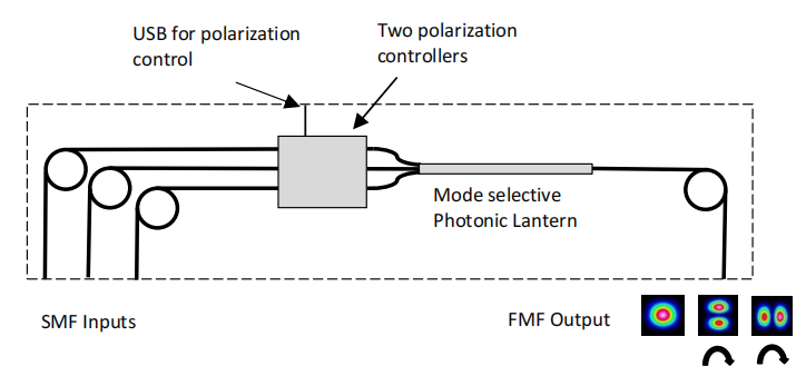 模式复用器/解复用器是围绕Phoenix Photonics模式选择全光纤提灯和PC控制的全光纤精密偏振控制器构建的。FMF的高阶模式(LP11和LP21)在传播期间旋转。控制输入的偏振状态允许模式的旋转以在接收器处进行最优解复用。